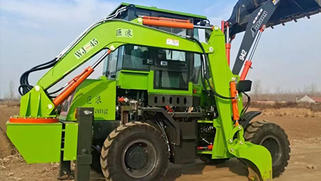連接復合動作一拖二操作手柄,簡介易操作由于它具有共同的結構,前端是裝載設備,后端為發掘設備。在施工時,操作手只需求翻滾一下座椅,就可以結束從裝載機到發掘機的改動